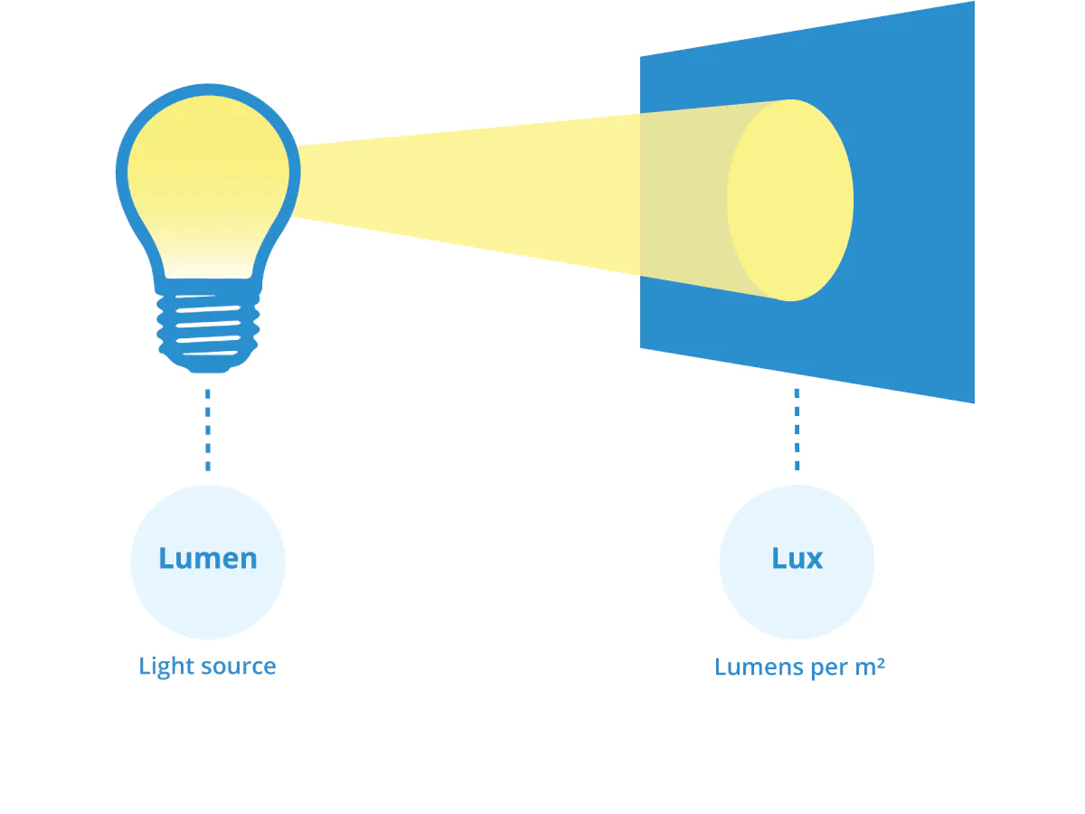 The difference between lumen and lux is that the lux takes into account the area over which the luminous flux (lumens) is spread. A flux of 1000 lumens, concentrated into an area of one square metre, lights up that square metre with an illuminance of 1000 Lux.
