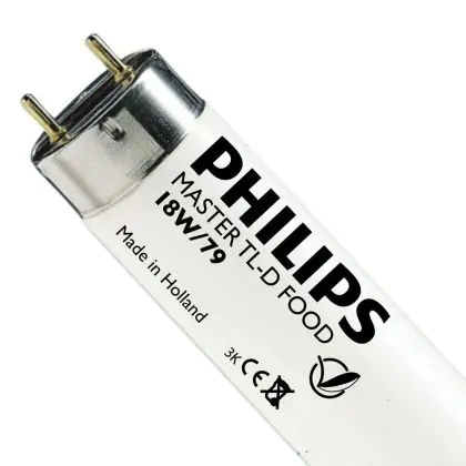 Philips TL-D Food are fluorescent tubes of 26 mm in diameter. These tubes are special because they can enhance food items, especially meat products. Philips TL-D Food 18W 79 - 59cm have a G13 base type and measure 59 cm.
