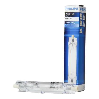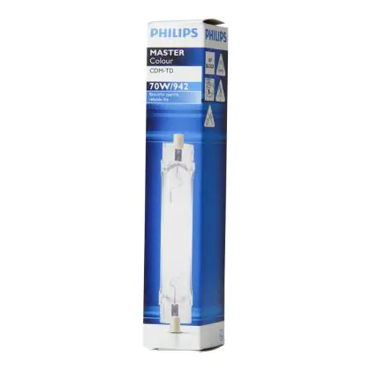 CDM-TD are compact double-ended discharge lamps with a brilliant light and excellent colour stability due to their ceramic burner technology. The Philips CDM-TD 70W 942 RX7s have a RX7S base type, which allows them to fit perfectly in your old fixtures. With an average lifespan of 16000 hours, the Philips CDM-TD 70W 942 RX7s provides energy savings of 30% compared to normal lamps.